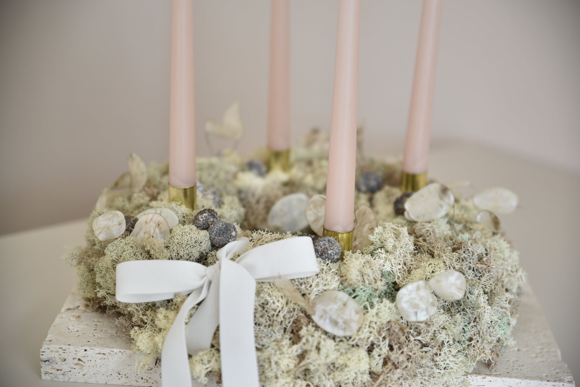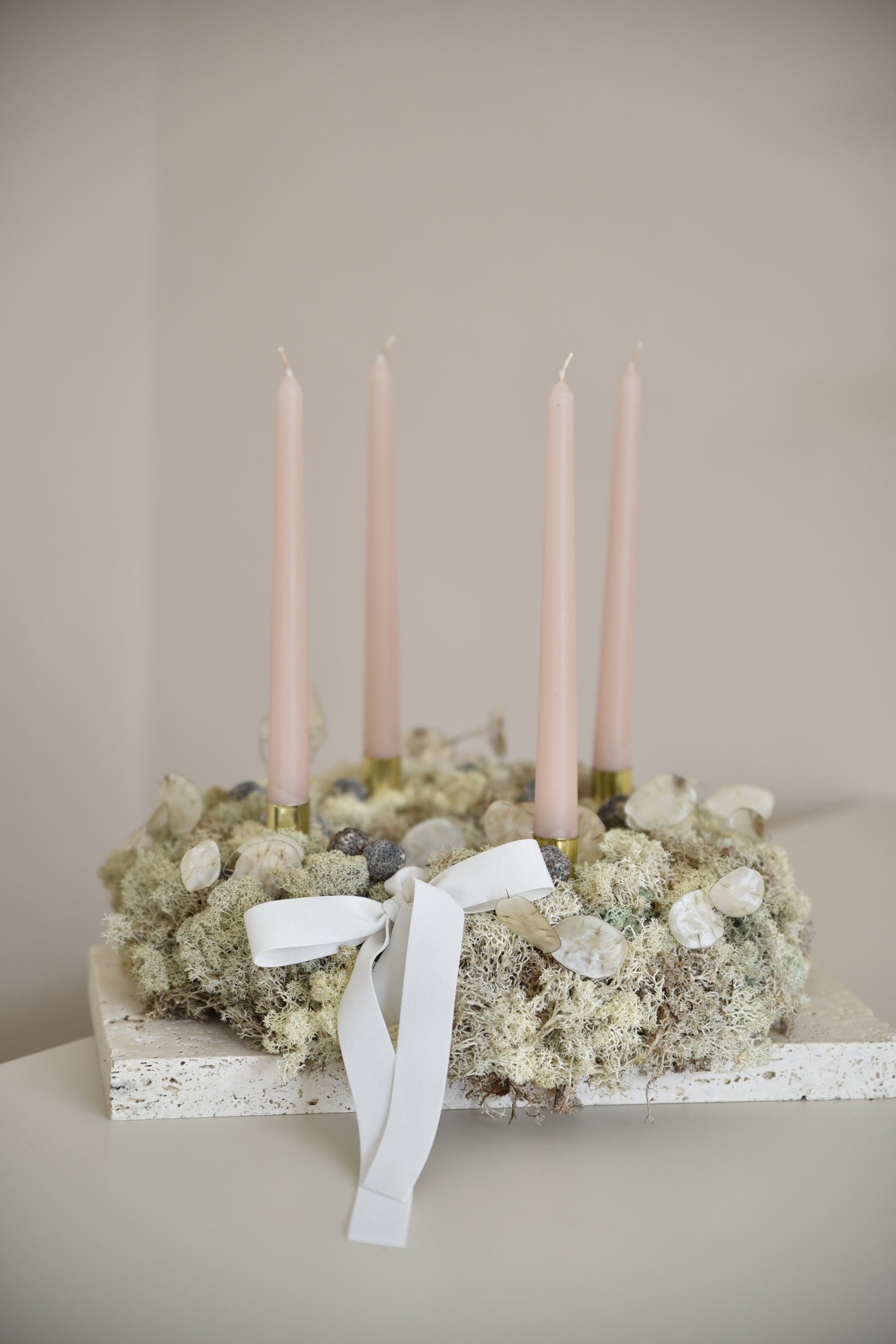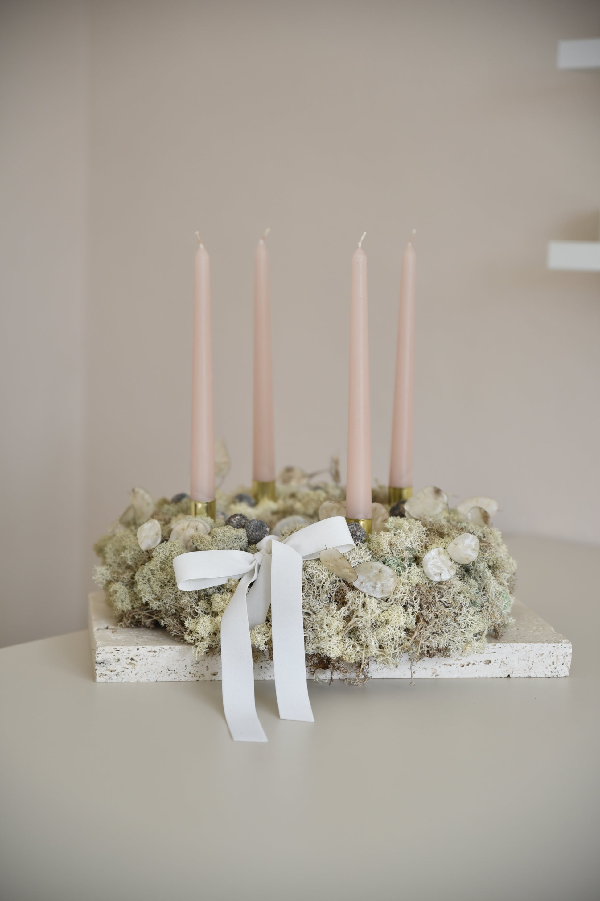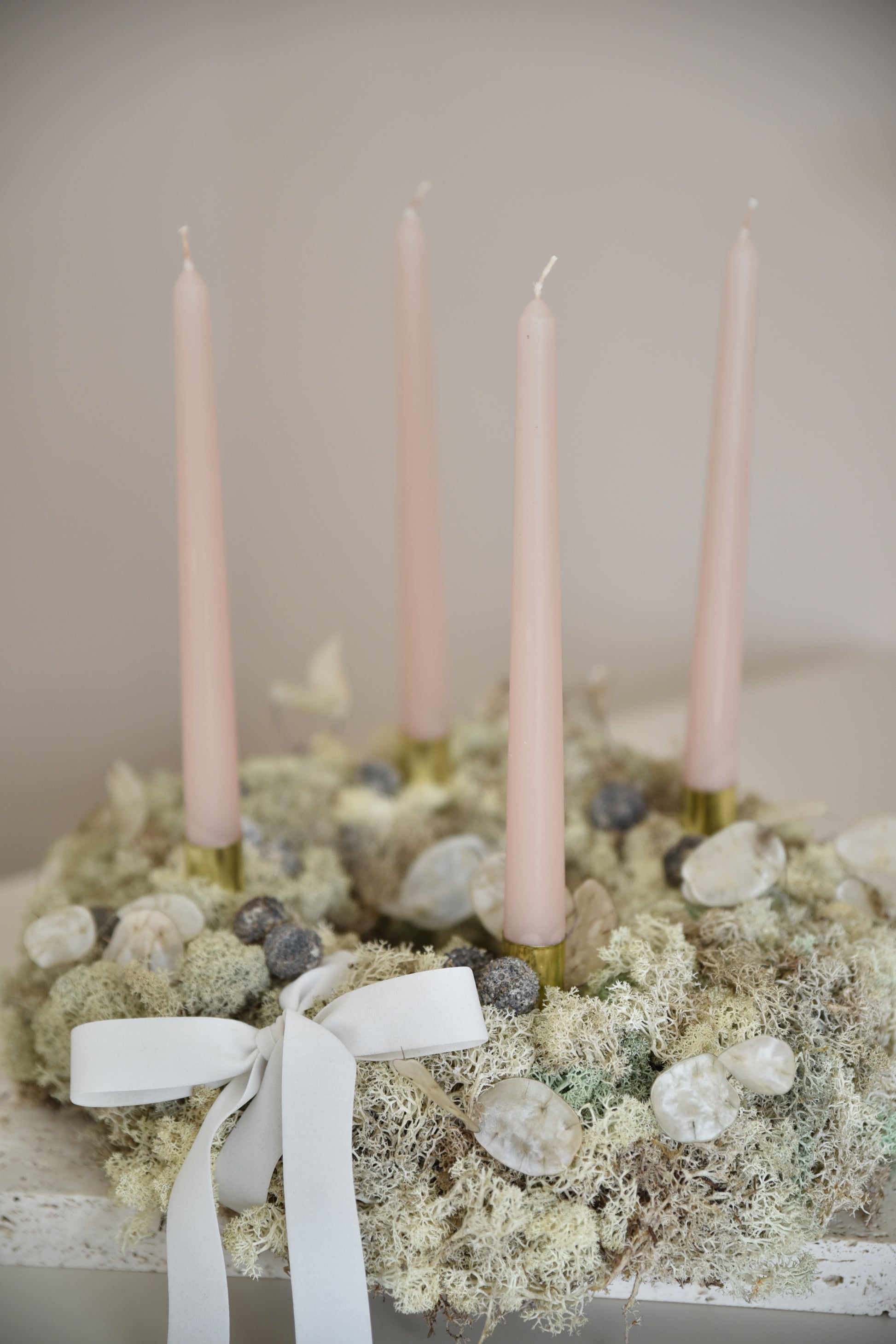 Adventný veniec z machu, vlastnoručne vyrobené. Obsahujú prírodné sušené prvky, držiaky na sviečky a sviečky (dávajte pozor, nenechávajte horiacu sviečku bez dozoru).