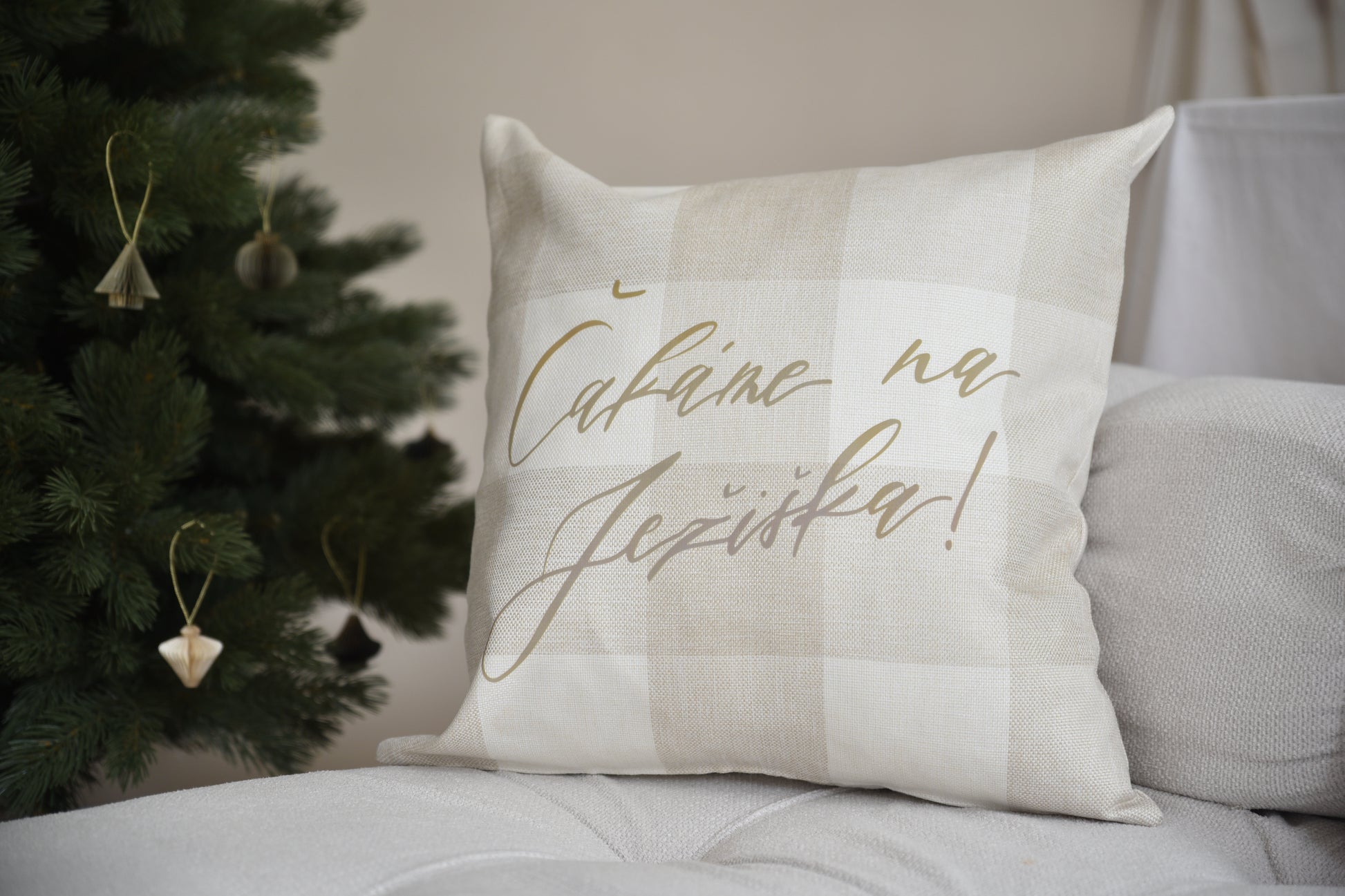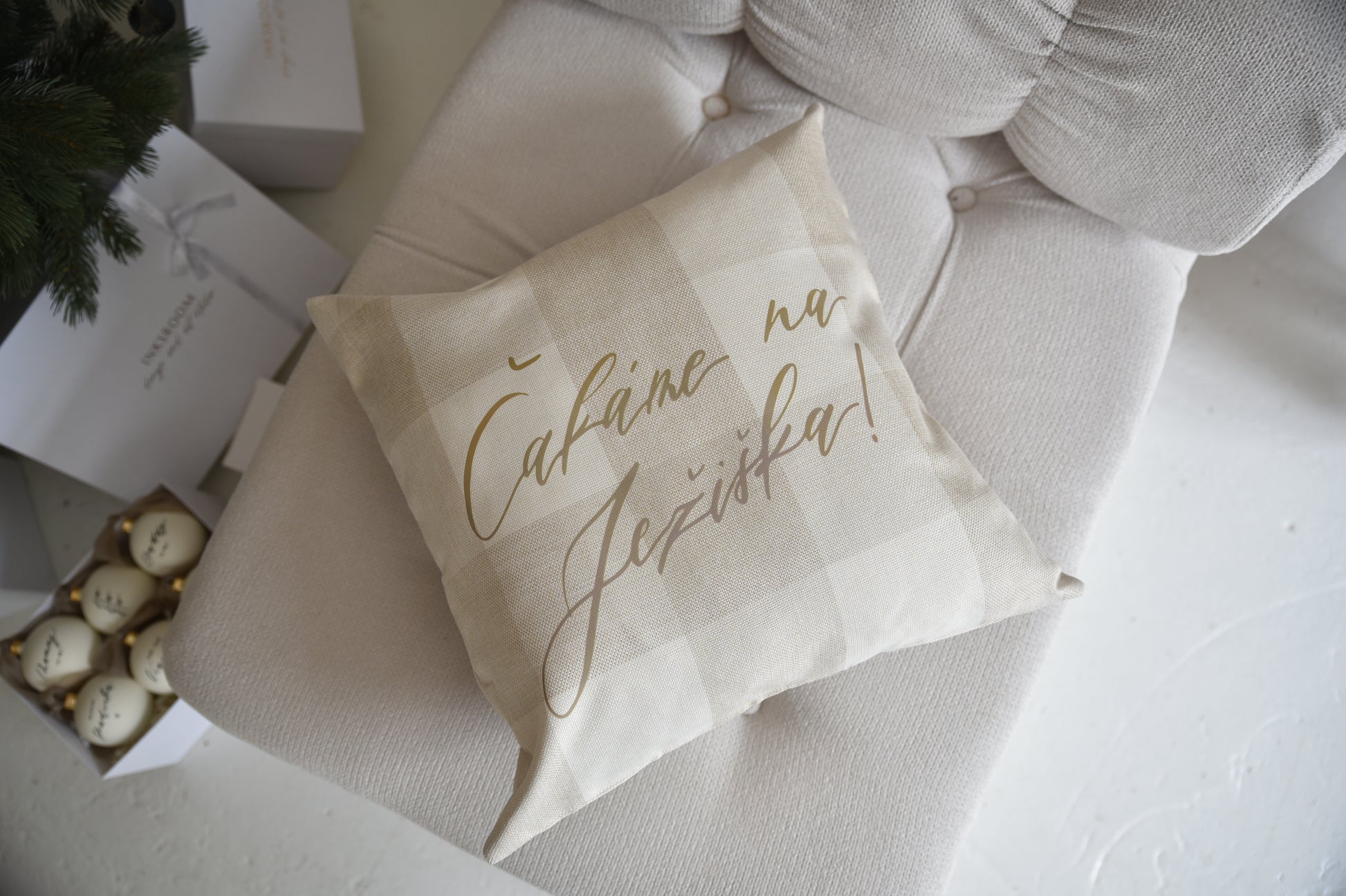 Bavlnená vankúšová obliečka s kaligrafickým písmom a jedinečným dizajnom, ručne kreslená a písaná našou Dóri. Našu jedinečnú textilnú kolekciu nájdete len u nás – prežite Vianoce výnimočne!